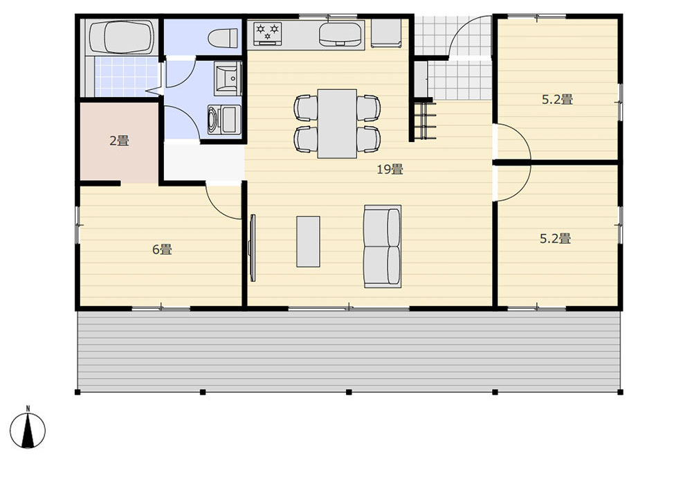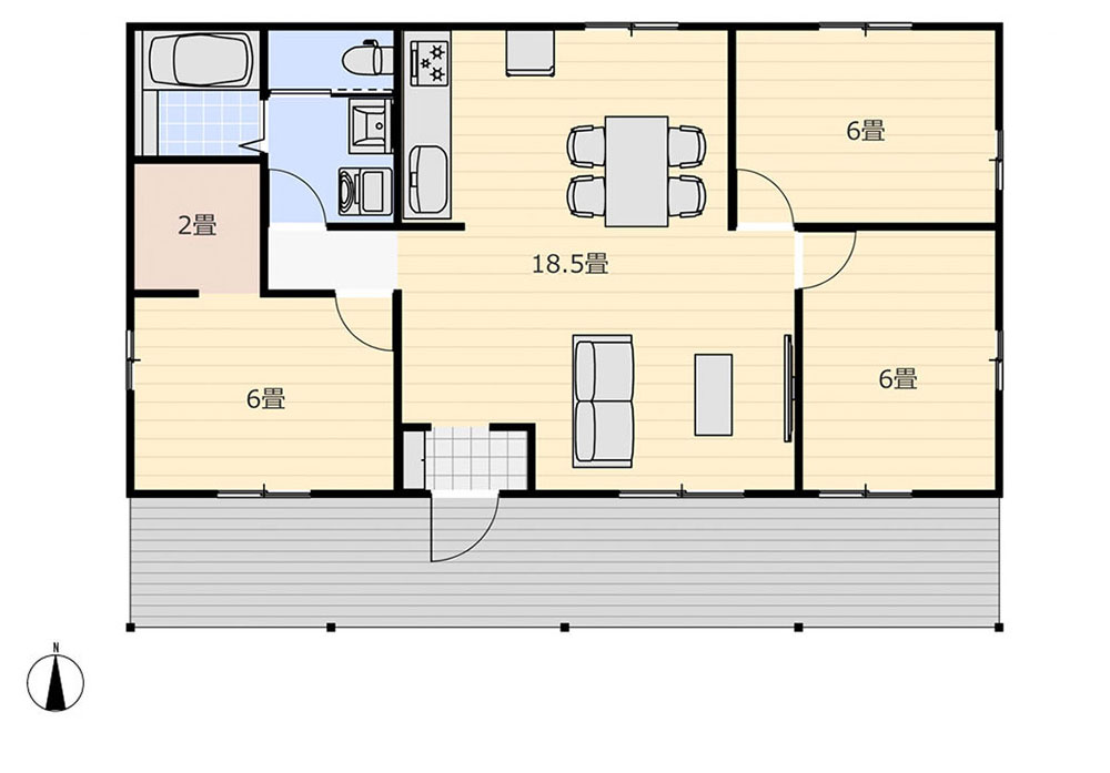 カリフォルニアスタイルのカヴァードポーチ ウッドデッキ付きの75.36㎡(22.79坪)平屋3LDK規格プラン
