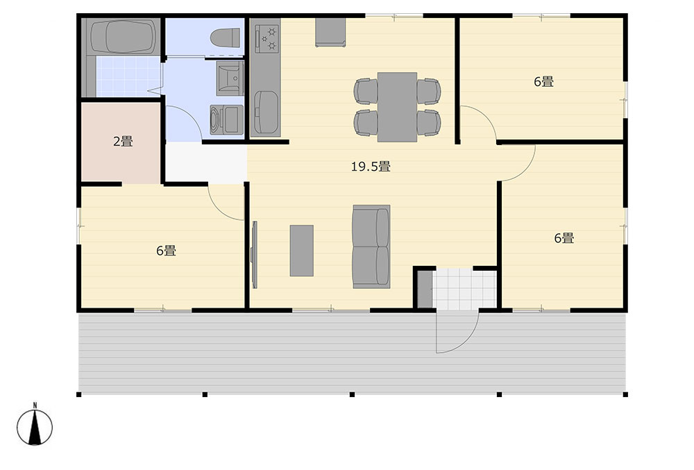 カリフォルニアスタイルのカヴァードポーチ ウッドデッキ付きの75.36㎡(22.79坪)切妻屋根の平屋3LDK規格プラン